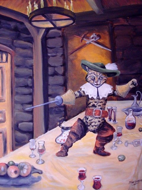 "Allez, Sieur le Chat Botté, en garde, je relève le gant, et lorsque nous aurons fini notre partie d'escrime, je vous vous convie à faire ripaille honorable, avec vin frais à foison"!